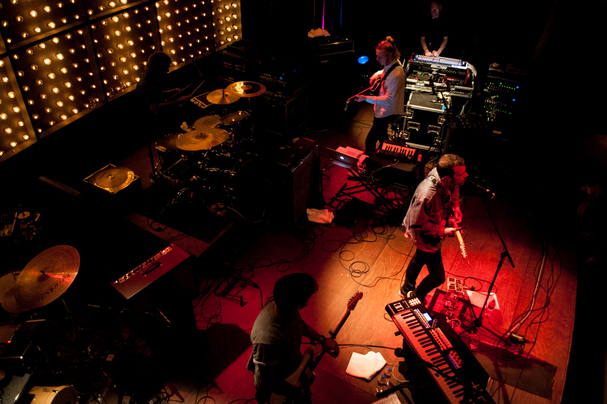 Klar ist: Ben Frost geht jetzt nicht auch noch. Der isländische Noise-Überflieger wäre im Mojo Club auf Hauschka gefolgt, wir wandern aber lieber zum Vereinsheim des FC St. Pauli ans Millerntor. Und das ist die goldrichtige Entscheidung. Da spielen heute Oum Shatt, eine Art Supergroup, derer unter anderem Kissogram und Schlagzeuger Chris Imler Teil sind. Letzterer hat gerade noch mit Herrn Friebe den Knust bespielt, nun sitzt er am Ende der schlauchförmigen Fankneipe und treibt diesen unfassbar tanzbaren Mix aus Franz Ferdinand'schem New Wave, Elektropop à la Whomadewho und - und das ist das abgefahrene - orientalischem Harmoniewerk voran. Mindestens mit "Hot Hot Cold Cold" hat diese Combo einen veritablen Hit im Gepäck, und spätestens dabei tanzt der ganze Laden. Bisher gibt es leider nur eine EP, wir hoffen dringlichst auf eine Fortführung dieses tollen Projekts in Albumform.