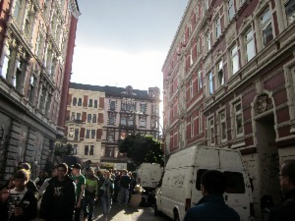 Die Sonne scheint grell und bereits herbstlich durch die Fenster der U-Bahn. Ein junger Mann sitzt mir gegenüber. Er trägt ausgewaschene Jeans und ein hellblaues Hemd. Sein Telefon klingelt: "Hi. Wie geht es dir?... Mhm… Ich geh nachher mit ein paar Leuten in die Schanze… Na, da ist doch Schanzenfest und das heißt heute Abend machen die wieder ordentlich Krawall da… Nee, ich mach bei so was nicht mit. Wir wollen nur zuschauen. Ist lustig. War letztes Jahr auch schon da. Hätte fast ne Flasche gegen den Kopf bekommen. Voll krass… Ja, geil oder? Komm doch auch mit! Wir zischen ein paar Bier und schauen denen beim Barrikaden bauen zu." Sternschanze steige ich aus und lasse mich von dem Menschenstrom mitreißen. In der Bartelsstraße steht der erste DJ. Direkt vor „Omas Apotheke“ legt er minimalistischen Elektropop auf, daneben ein kleiner Tapeziertisch, übervoll mit Mädchenklamotten. „Alles nur 1€“, rufen die Mädchen, die ihre Klamotten zum Verkauf anbieten, und schwingen dabei ihre ASTRA-Flaschen im Takt der Musik.