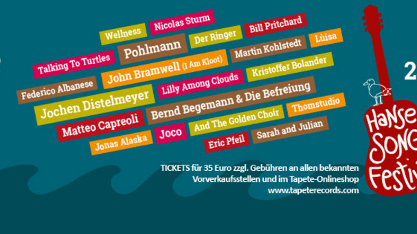 Mit Jochen Distelmeyer gibt es einen der wichtigsten deutschen Musiker zu sehen. Pohlmann und Matteo Capreoli bedienen die Pop-Seele. And The Golden Choir und Talking To Turtles sind bekannte Lieferanten großer Musik im Kleinen. Lilly Among Clouds, Sarah & Julian, Der Ringer oder Joco stehen für einen musikalischen Nachwuchs, den man vielleicht zum letzten Mal in kleinen Clubs zu sehen bekommt. Bernd Begemann steht für riesengroßes Entertainment mit unfassbar viel Charme und Spielfreude. Freunde stilvoller Klavierkunst kommen bei Federico Albanese und Martin Kohlstedt mehr als auf ihre Kosten. Und Holmes-Sänger Kristoffer Bolander sowie I Am Kloot-Kopf John Bramwell bringen skandinavisches bzw. britisches Flair mit.