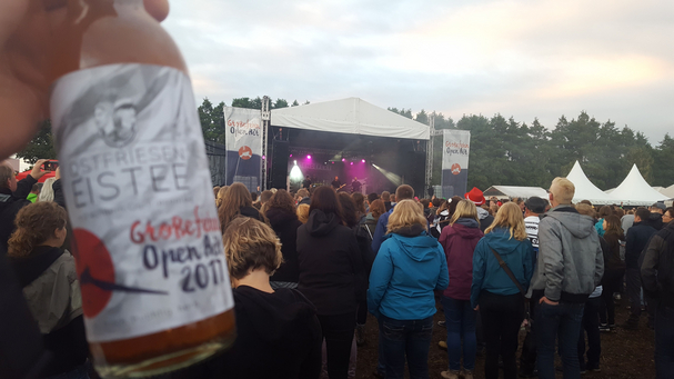 Mein Trupp an Verrückten von vor zwölf Jahren fällt mir wieder ein; wir hatten uns aus Lustigkeit „Punk’s not Dad“-Shirts gedruckt und kriegten Sprüche, aber das war uns egal, denn wir hatten diese zwei Tage und den Matsch und den Sound, und den Matsch, den gibt es auch beim Großefehn Open Air, weil es, typisch für Ostfriesland, natürlich in den Tagen davor sattes Schietwetter gegeben hatte und Sintfluten niedergegangen waren, so dass die Gummistiefel hier der wertvollste Besitz sind, weil das Gelände längst eine Matschwüste ist. Ich warte im Gedränge auf den Einlass und steuere erstmal die nächste Bierbude an - das Lebenselixier des Festivalisten kostet hier 2 Euro. Völlig aus der Zeit gefallen. Völlig gut. Cola-Korn gibt’s natürlich auch, wir sind hier nicht in der Stadt, Diggi. Das Highlight ist der Ostfriesen-Eistee, der mit echtem Ostfriesentee und Zitronenlimo angesetzt ist und unfassbar lecker schmeckt. Ick bün to huus.