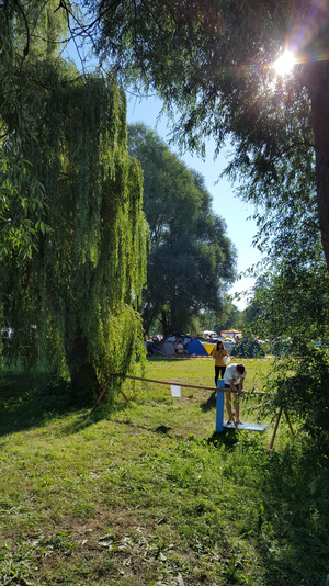 Der Campingplatz könnte ebenfalls hinter den riesigen Trauerweiden und umsäumt von höhen Bäumen, die bei der irren Hitze wohltuenden Schatten spenden, kaum idyllischer gelegen sein, läge er nicht direkt an der Hauptstraße, die durch Storkow führt. Das ist ein Gegenentwurf zur typischen Festivalwiesencamperei auf Acker XY, doch es fällt eigentlich nicht weiter ins Gewicht, so still ist es hier. Die Bürgersteige sind früh hochgeklappt hier, und neben der bemerkenswerten Tatsache, dass wir für ein Festival, das immerhin mitten im Ortskern stattfindet, überhaupt kaum Einheimische zu sehen bekommen, fährt nachts bis in den wochenendlichen Morgen hinein eigentlich kaum nenneswert Verkehr die Straße entlang, die eine etwaige Nachtruhe ernsthaft stören könnte.
